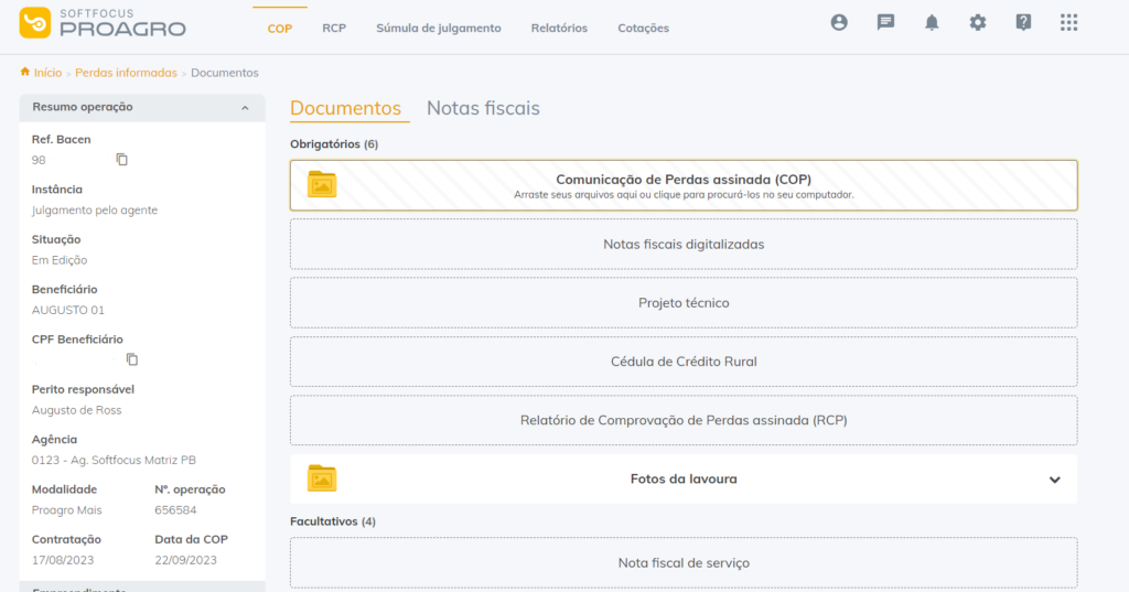 Após solicitar análise, não será mais possível incluir documentos. Você poderá acompanhar a operação através do status da coluna Andamento na tela de listagem de COP’s. (Veja: Acompanhando o andamento da COP)