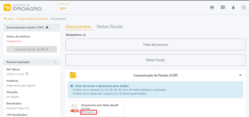 Para visualizar outros documentos já anexados pela agência/cooperativa, basta clicar sobre o documento e selecionar Visualizar.