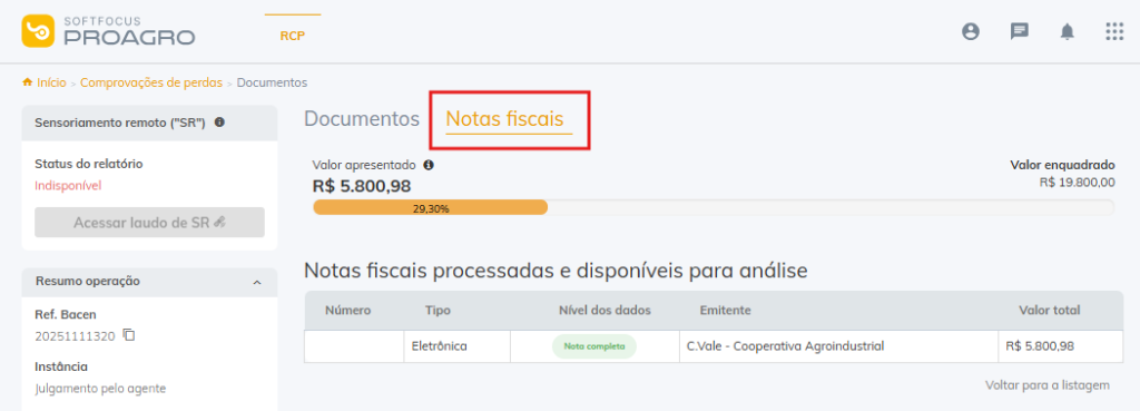 É possível visualizar as notas fiscais eletrônicas ou manuais, anexadas pela agência/cooperativa, acessando a aba Notas fiscais