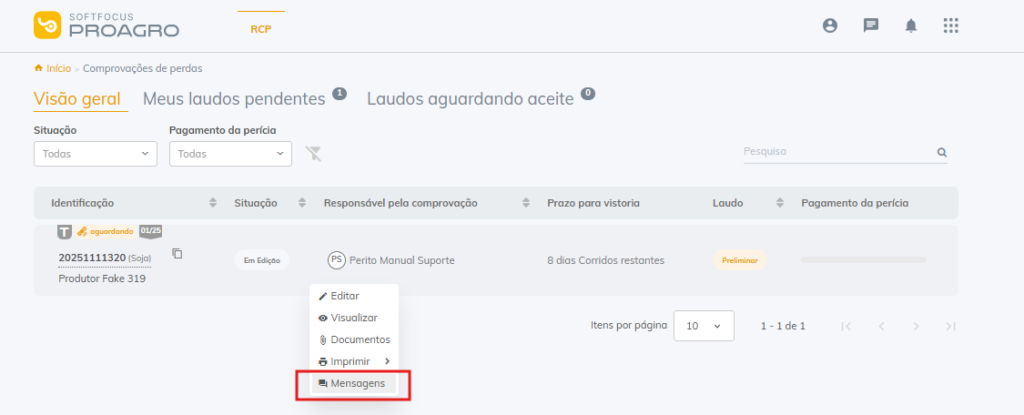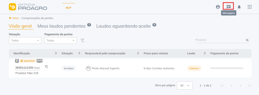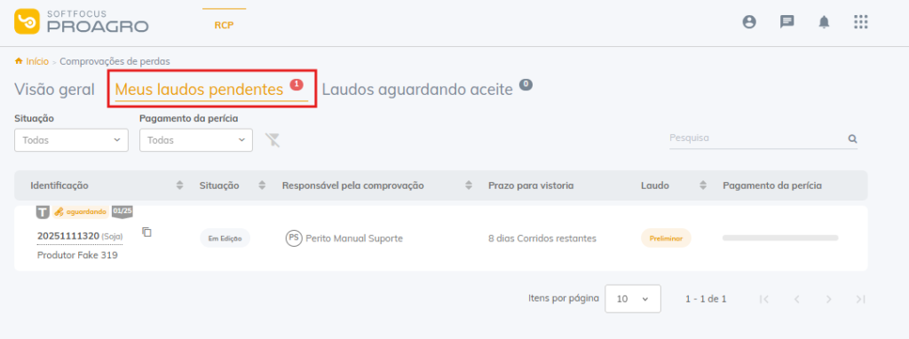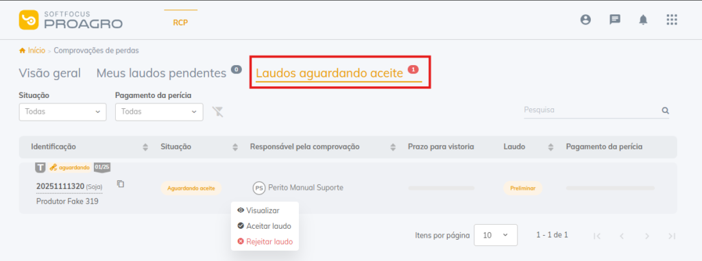 - Aguardando aceite: o RCP ainda aguarda a confirmação do perito quanto à aceitação ou não da realização da comprovação de perdas.