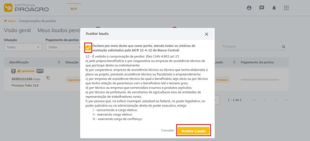 Ao aceitar o laudo, aparece o check box, no qual deve ser marcado para que a opção de “Aceitar laudo” fique disponível.