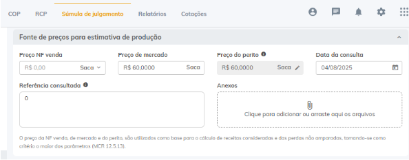 Neste momento, é possível informar o preço da nota de venda da produção ou o preço de mercado. Caso ambos sejam informados, conforme o MCR, o sistema considerará automaticamente o maior valor.