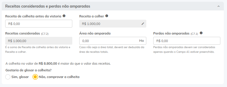 - Quando o valor das receitas consideradas for inferior ao valor da colheita, será apresentada a opção “Gostaria de glosar a colheita”, com os seguintes comportamentos: