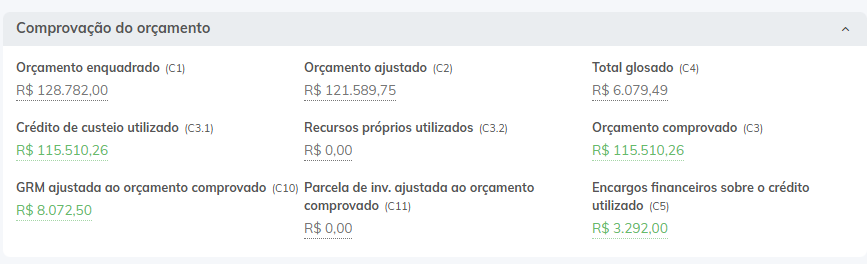 Nesta etapa, são exibidos os valores relacionados ao orçamento, tais como glosas, crédito de custeio utilizado, recursos próprios utilizados, garantia de renda mínima, entre outros.