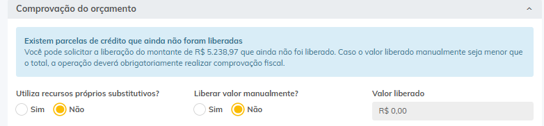 Em operações nas quais o valor comprovado é superior ao valor liberado até o momento, e já tenha sido solicitada à instituição financeira a liberação desse crédito, mas ela ainda não tenha ocorrido no momento do julgamento, o sistema exibirá um aviso informativo sinalizando essa situação.