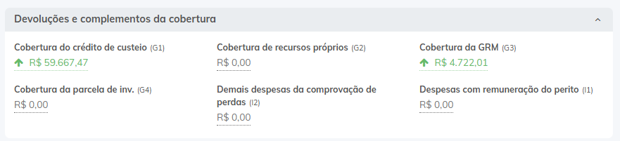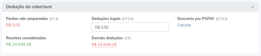 Os valores apresentados neste campo são descontados no cálculo da cobertura. O campo “Demais deduções” corresponde à soma de: perdas não amparadas, deduções legais, desconto por PGPAF e receitas consideradas.