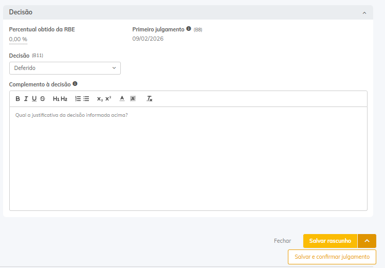 Para salvar como rascunho ou salvar e confirmar julgamento, o procedimento segue o mesmo fluxo explicado para o envio da primeira análise, não havendo diferenças no processo.