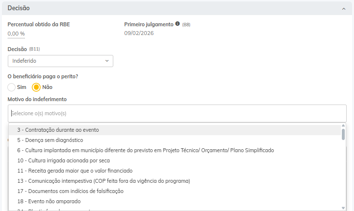 Além disso, ao selecionar a decisão Indeferido, é habilitado um campo adicional de justificativa, no qual é apresentada uma listagem de motivos de indeferimento. Basta selecionar o motivo aplicável para registrar a justificativa da decisão.