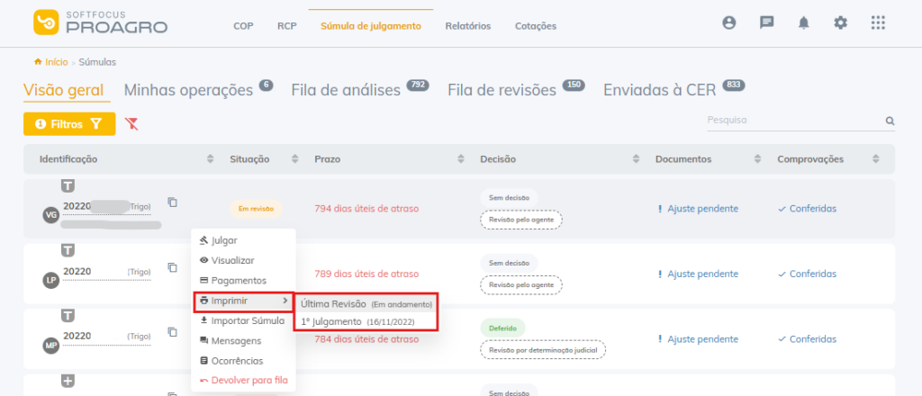 O sistema poderá apresentar todas as súmulas de revisões existentes, bem como destacar a última revisão, conforme a situação atual da operação.