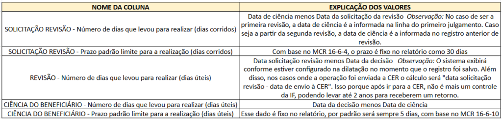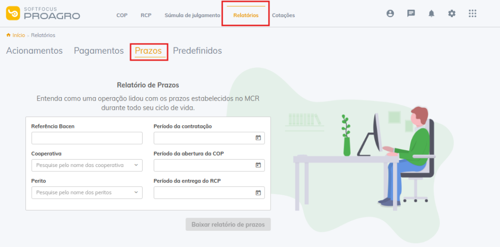 Na aba Relatórios, é possível gerar um relatório de prazos, que permite analisar como uma operação cumpriu os prazos estabelecidos no MCR ao longo de todo o seu processo.