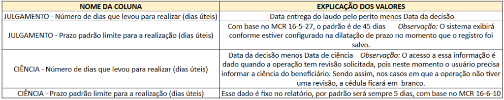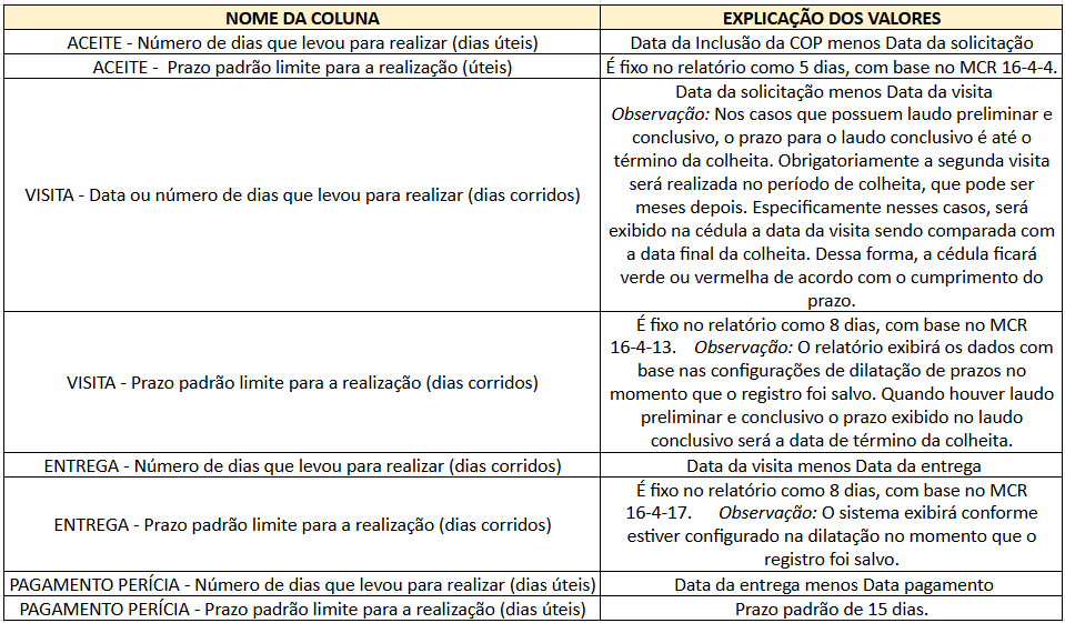 Os conceitos utilizados nos cálculos apresentados no relatório de prazos do Softfocus Proagro são descritos a seguir. O conteúdo está organizado em três seções — Perícia, Primeiro Julgamento e Revisão — contemplando o nome de cada coluna e a explicação dos respectivos valores.